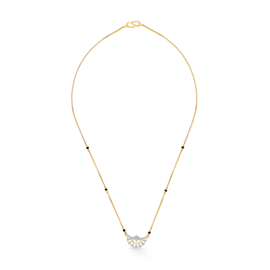 Elevate your elegance with this stunning mangalsutra, crafted for the modern woman who values tradition with a contemporary touch. The shimmering diamonds add a radiant sparkle, perfectly complementing the classic black beads.